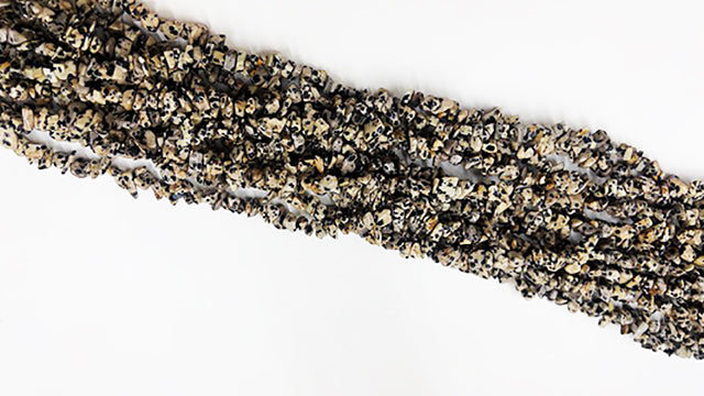 Elevate your style with our Dalmatian semi-precious chips. 32" strand for versatile, trendy jewelry. Unleash the unique beauty of natural stones today!